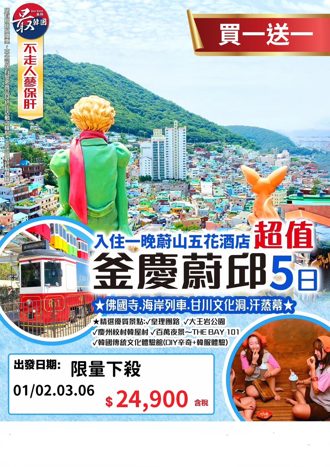 (買一送一)超值釜慶蔚邱~佛國寺.海岸列車.大王岩.甘川文化洞.汗蒸幕五日(不走人蔘保肝)(3)