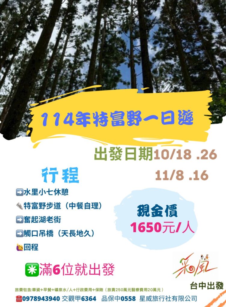 114年特富野一日遊 出發日期:10/18 .26 11/8 .16 報名費用:(現金價)1650元/ […]