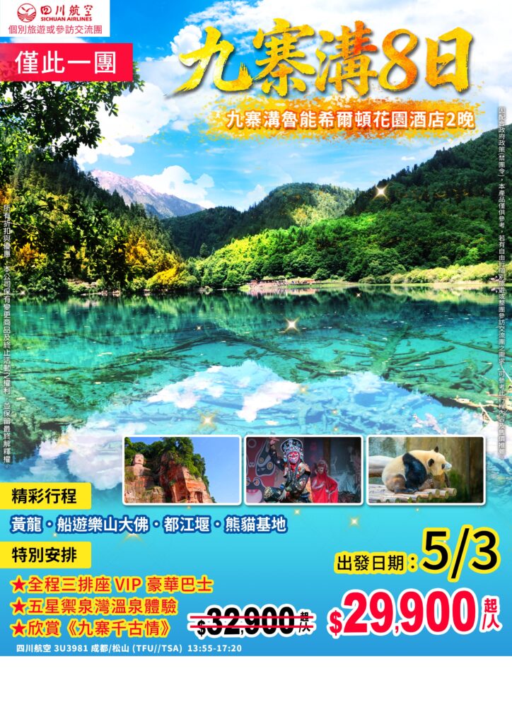 20260503 全球傳奇 九寨。三大世遺希爾頓8日黃龍船遊樂山大佛都江堰熊貓基地九寨千古情(3)