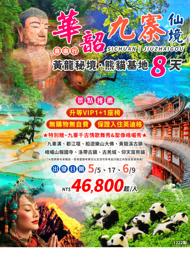 華韶九寨仙境‧黃龍秘境8天~熊貓基地、峨嵋、樂山大佛、贈雙秀、英迪格酒店、升等VIP1+1(22)