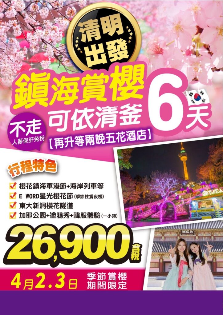 櫻花-可依清釜鎮海賞櫻去(再升等兩晚五花酒店)~6天《不走人蔘+保肝+免稅店》(14)