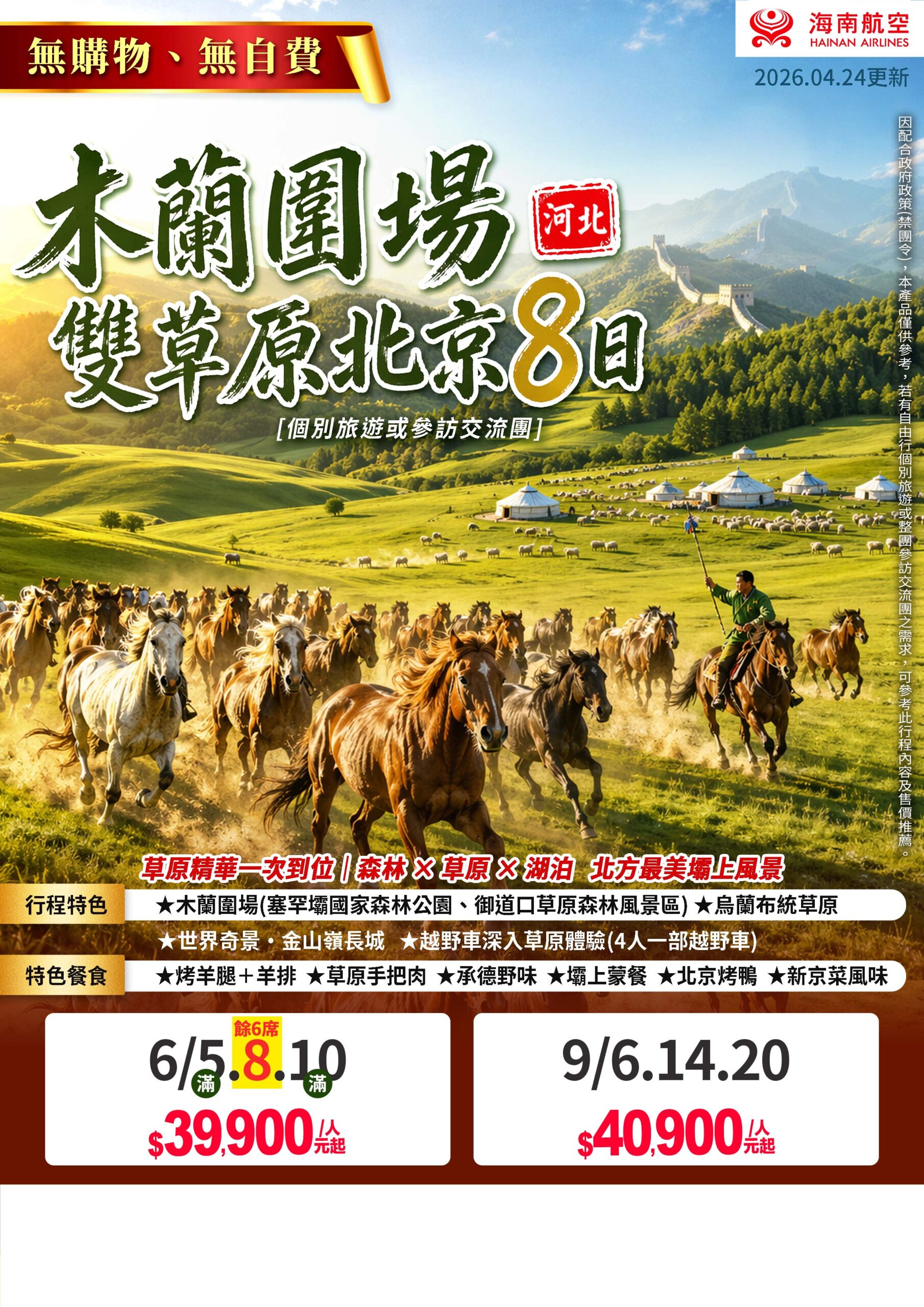 【全球傳奇】冀情山水★河北木蘭圍場草原、壩上草原、北京8日【無購物】(3)