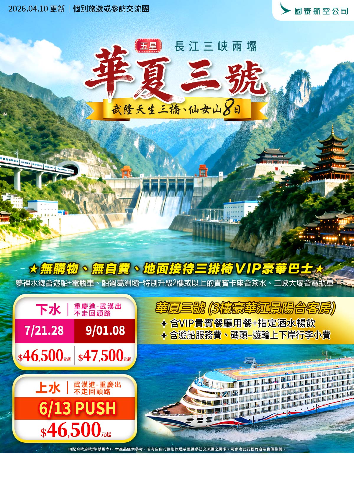 【全球傳奇】長江三峽兩壩【超5★華夏三號】上水+武隆天生三橋、仙女山8日(3)