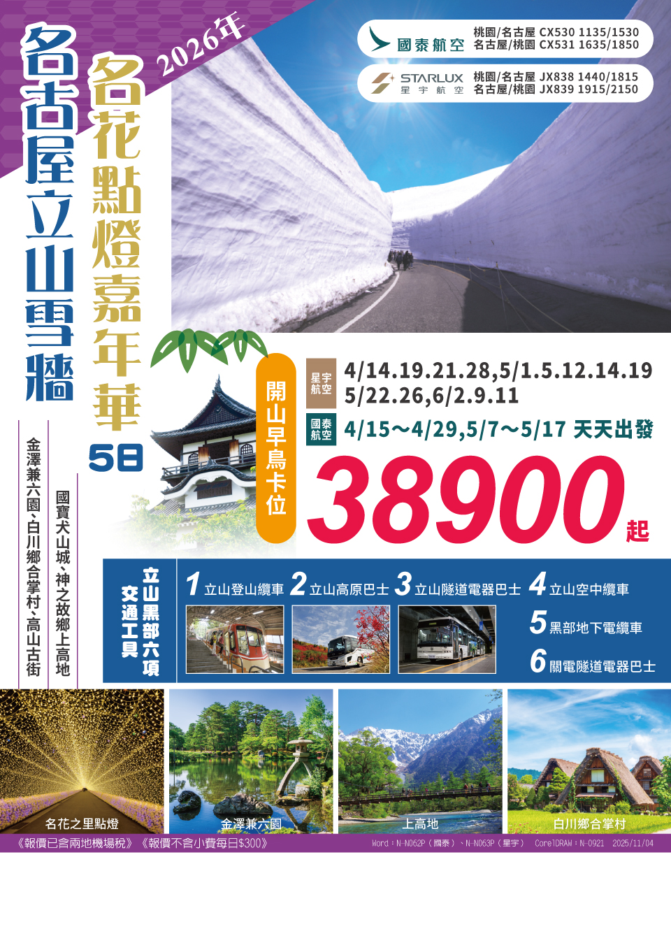 國泰航空【名古屋立山雪牆~名花點燈嘉年華5日】金澤兼六園 白川鄉合掌村 高山古街(2)