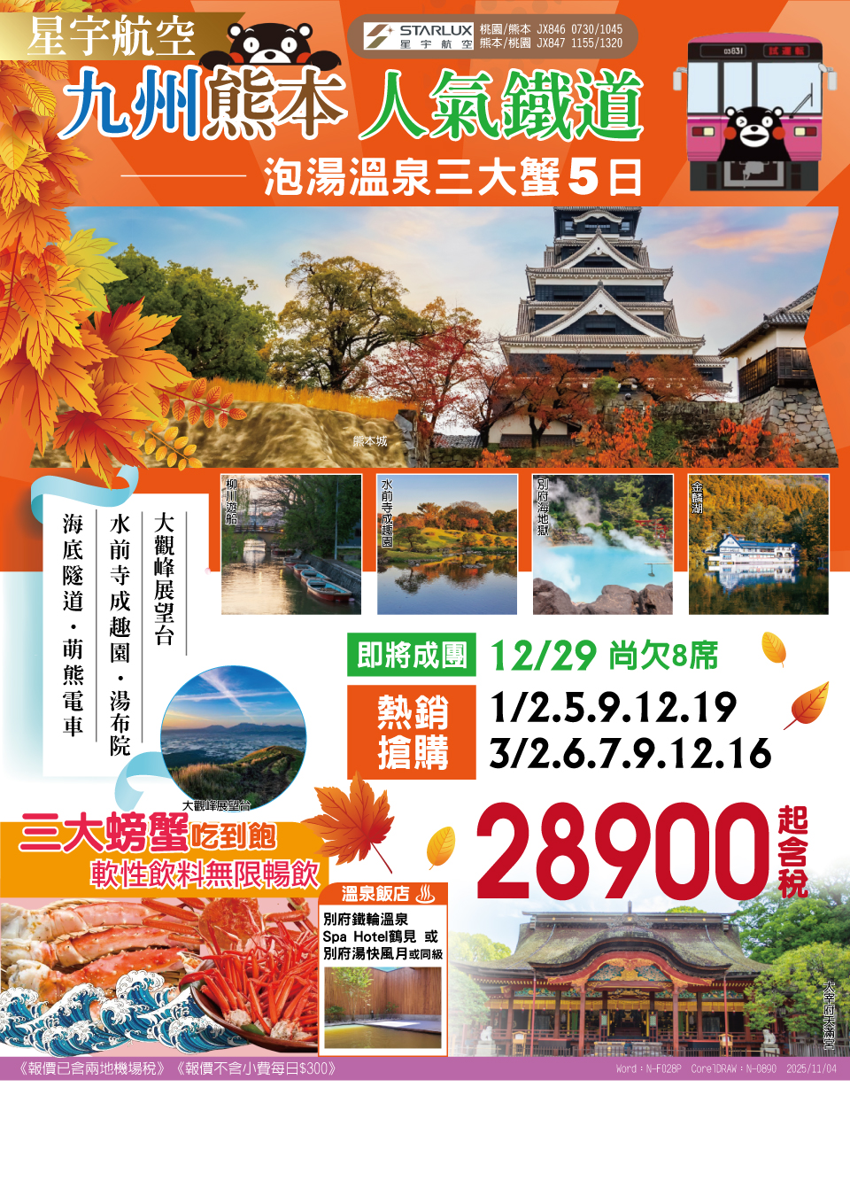 星宇航空【九州熊本人氣鐵道~溫泉三大蟹5日】海底隧道 萌熊電車 水前寺成趣園 (2)